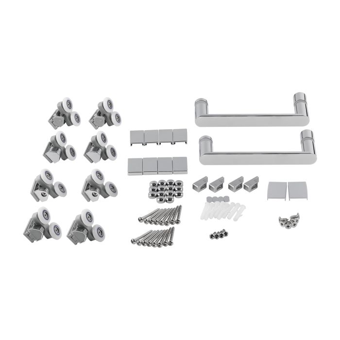 Комплектація:комплект кріпильних деталей , глухе скло , скляні двері , подвійні ролики , ручки , набір ущільнювачів , бічні профілі , розширювальні профілі , заглушки , верхній профіль , нижній профіль , з'єднувальні елементи , фіксатори