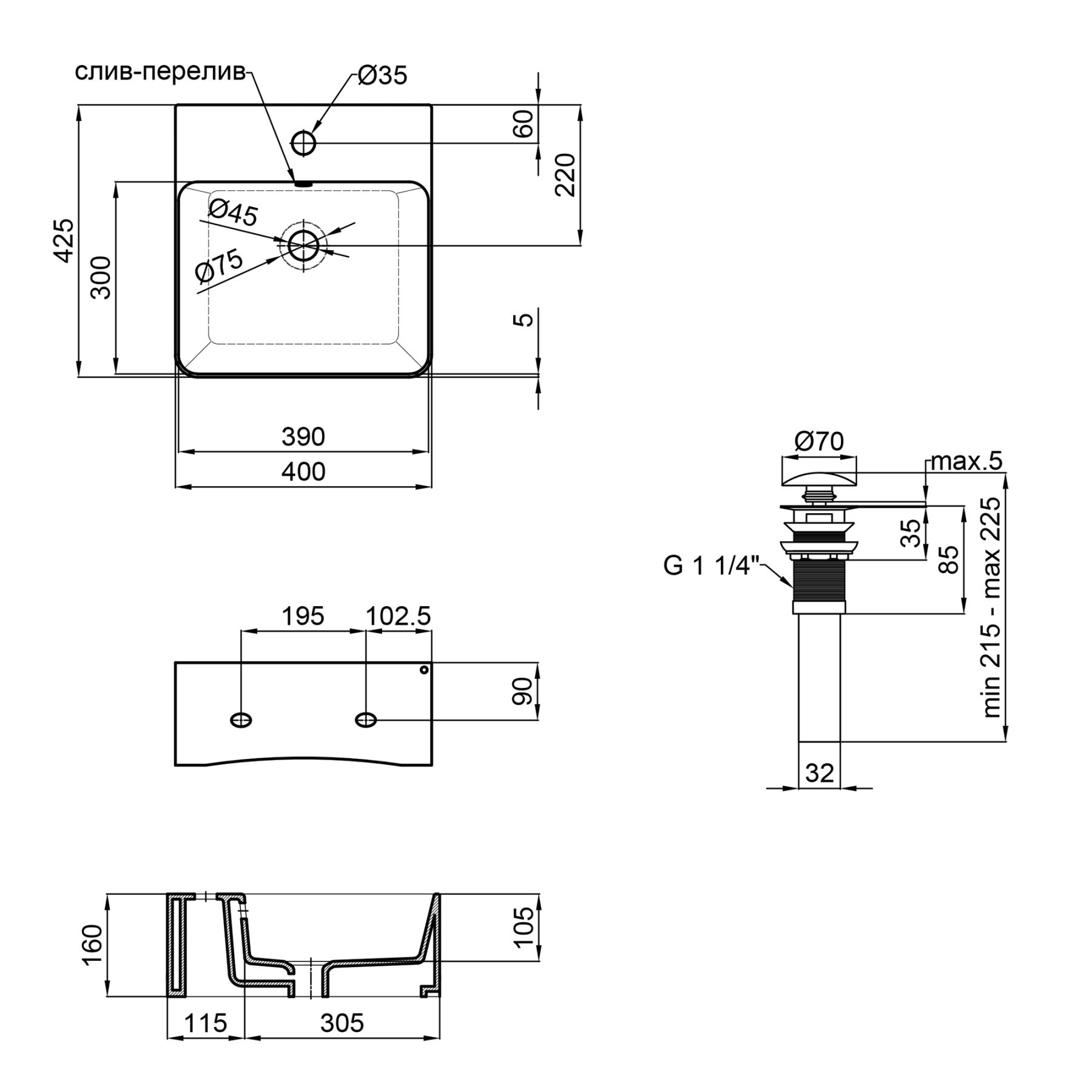 Розмір раковини, мм:400х425