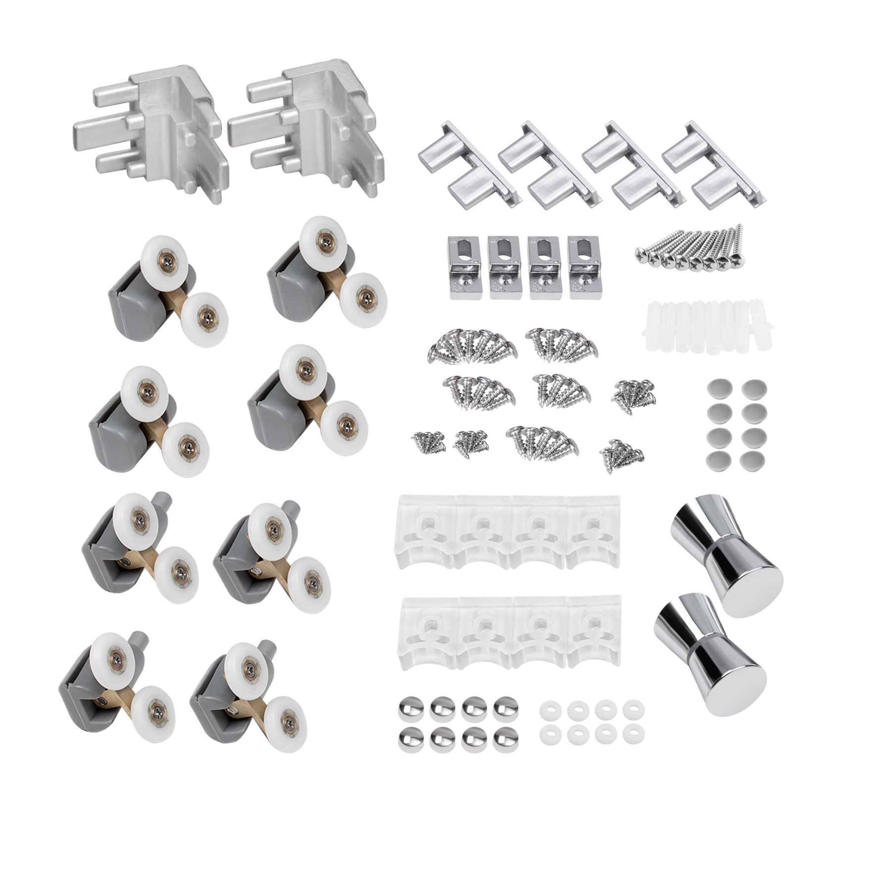 Комплектация:профиль , комплект крепежных деталей , глухое стекло , стеклянная дверь , двойные ролики , ручки , соединительный элемент
