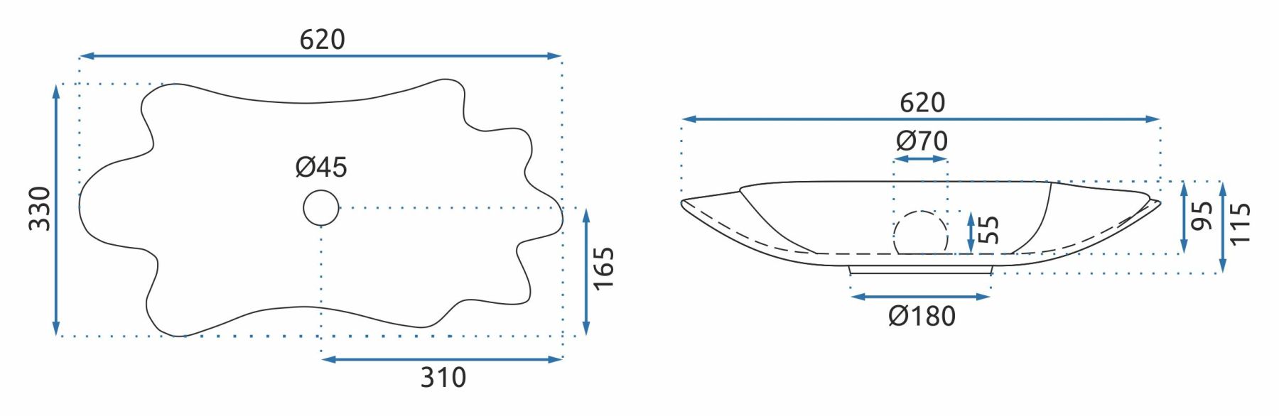 Незвичайна форма додає раковині елегантності та сучасності, що привертає погляди й створює відчуття чистоти та охайності. Накладна конструкція раковини дає можливість розмістити її на будь-якій поверхні, і дозволяє легко доглядати за нею. Матеріал - кераміка - є довговічним та міцним, дозволяє не тільки довго тримати свій первозданний вигляд, а й захищає раковину від пошкоджень та царапин.
