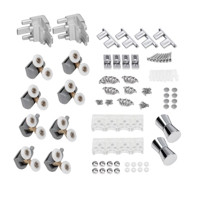 Комплектация:профиль , комплект крепежных деталей , глухое стекло , стеклянная дверь , двойные ролики , ручки