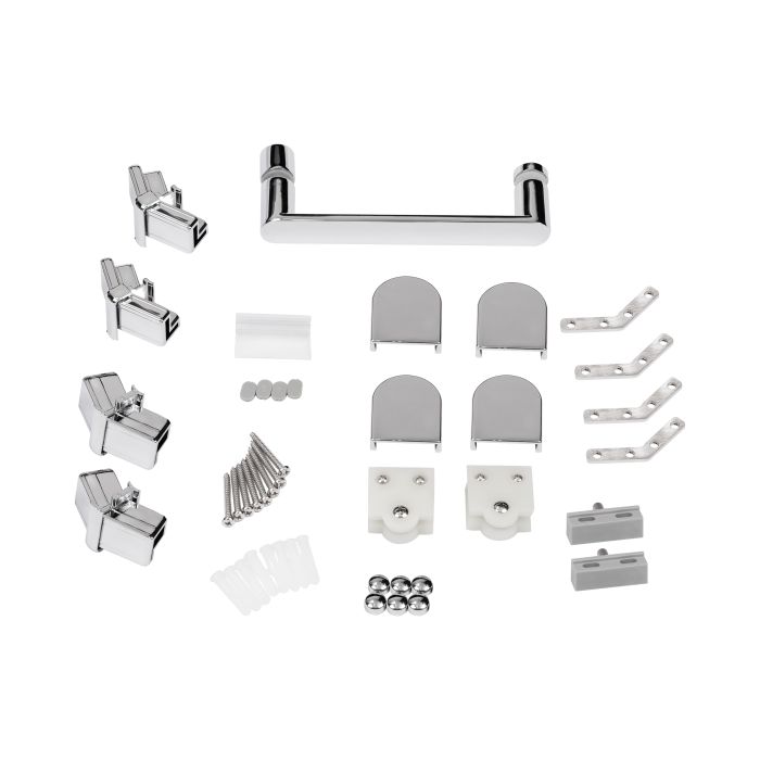 Комплектация:петли , комплект крепежных деталей , глухое стекло , стеклянная дверь , ручка , набор уплотнителей , боковые профили , расширительные профили , заглушки , верхний профиль , нижний профиль , держатели стекла