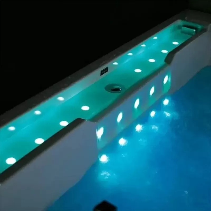 Данная модель ванны комплектуется системой гидромассажа и аэромассажа, подогревом воды, системой водопада и аэрофорсунками с LED подсветкой. Насосы в гидромассажной ванне работают практически бесшумно. Ванна имеет значительный объем, выполнена из толстого листового акрила и имеет мощный каркас из нержавеющей стали.