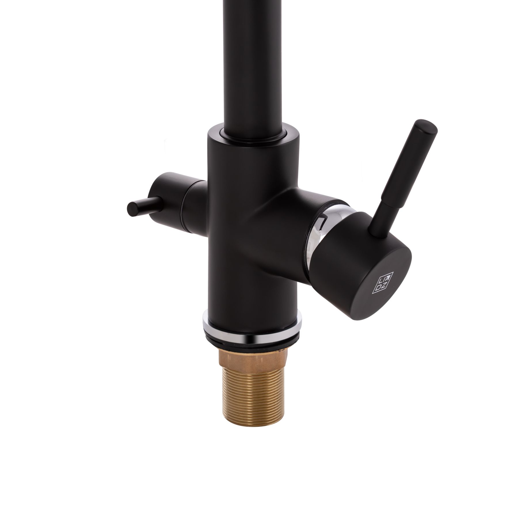 Смеситель для кухни с фильтром Lidz (BLA) Over 38 020 изготовлен из высококачественной латуни. Благодаря матовой черной поверхности имеет оригинальный внешний вид. Выполнен в современном сдержанном стиле. В изделии предусмотрены 2 излива: под воду для бытовых расходов и с фильтром для питьевой воды. Такой смеситель имеет дополнительный рычаг, позволяющий переключать режим на подачу питьевой воды. Он не только удобен и практичен, но и станет идеальной находкой на кухне.